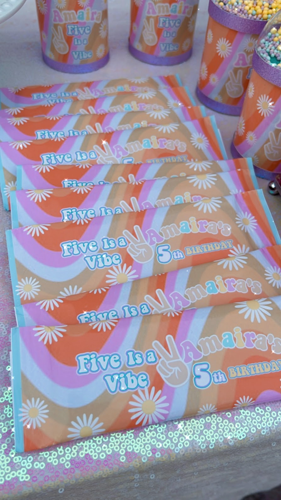 These beautiful personalized GROOVY theme custom made chocolate covered wraps provides a unique touch to your event to make it a memorable one. They add a beautiful decor on the desert/cake table.